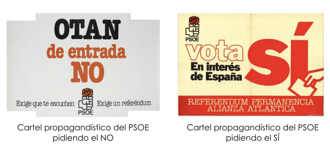 Concretamente, en el subapartado AUDIOVISUALES se puede acceder a un reportaje de unos tres minutos sobre cómo fue «el controvertido ingreso de España a la Alianza Atlántica», emitido por RTVE en 2022. En el vídeo, se puede comprobar el cambio de postura del PSOE de Felipe González, que pasó del eslogan «OTAN de entrada NO» ideado cuando estaba en la oposición por Alfonso Guerra (como se puede ver en el primer artículo del subapartado HEMEROTECA publicado en El País), al «En interés de España vota sí» que defendió en un referéndum cuando ya gobernaba.