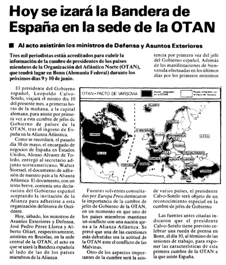 En un momento de evidente tensión entre el actual Gobierno español y la OTAN, con motivo del presupuesto a destinar ante los numerosos conflictos internacionales existentes, resulta interesante recordar que la entrada de España en la Organización del Tratado Atlántico Norte se produjo el 30 de mayo de 1982, cuando gobernaba el centrista Leopoldo Calvo-Sotelo.