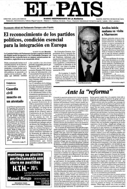 El martes 4 de mayo de 1976 se publicó el primer número del diario El País, el primer periódico generalista que se creaba tras la muerte de Franco, aunque entre sus primeros accionistas figuraban destacadas figuras destacadas del franquismo final como José María de Areilza y Manuel Fraga. Fundado por José Ortega Spottorno, su primer director fue Juan Antonio Cebrián. El diario reclamó constantemente la democracia y sufrió por ello críticas y ataques ultraderechistas destacando el atentado con bomba sufrido el 30 de octubre de 1978, en el que murió un joven conserje.